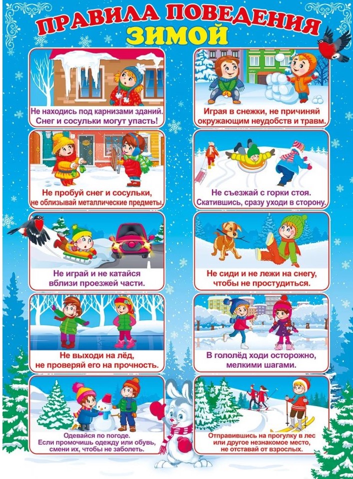 - Соблюдай правила дорожного движения. Знай, что зимняя дорога опасна. Не играй на проезжей части дорог, ж/д полотна, водоёмах; не выходи на лёд.