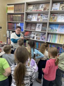 С теплой улыбкой Пенкина Т.К. провела для детей увлекательную экскурсию по уютным залам библиотеки, где познакомила ребят с богатым книжным фондом, поделилась интересными фактами из жизни известных писателей и показала самые красочные и занимательные издания, которые библиотека с гордостью хранит на своих полках.