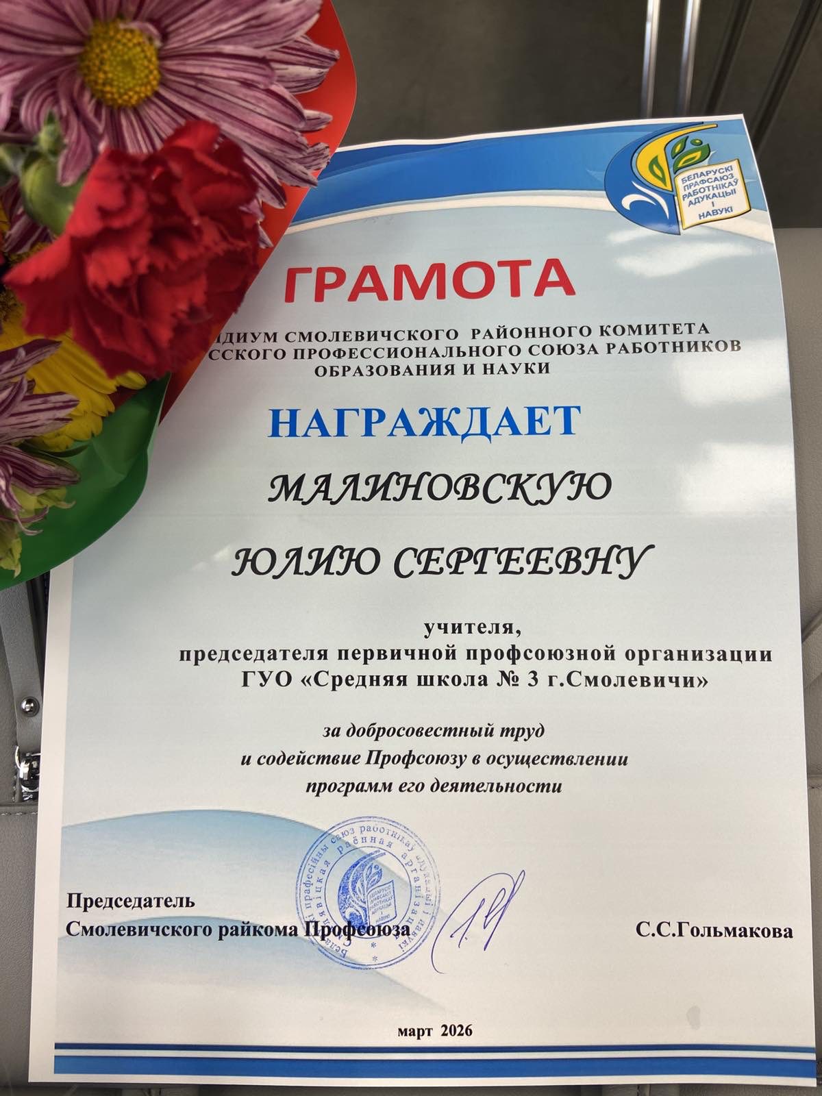Председатель ППО ГУО «Средняя школа №3 г. Смолевичи» Юлия Сергеевна Малиновская приняла участие в заседании районного комитета Белорусского профсоюза работников образования и науки.
