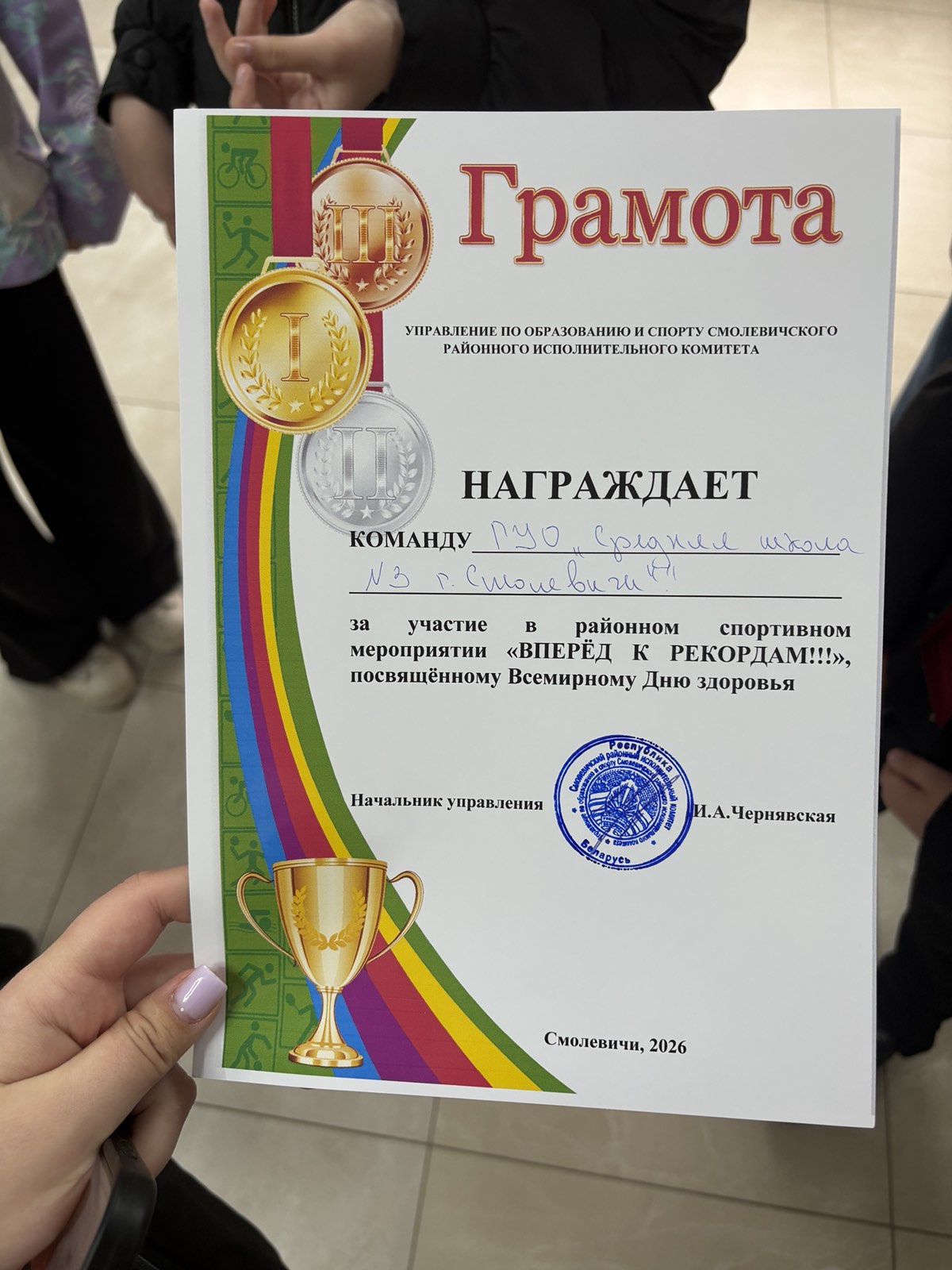 Получили грамоту от Управления по образованию и спорту Смолевичского райисполкома. Движение — это жизнь, а спорт — это характер! Благодарим команду за волю к победе и активность. 🏃♀️🏃♂️